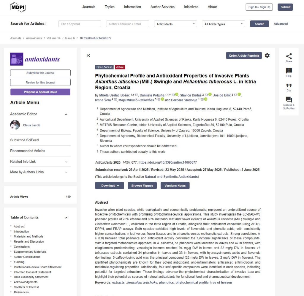 Phytochemical Profile and Antioxidant Properties of Invasive Plants Ailanthus altissima (Mill.) Swingle and Helianthus tuberosus L. in Istria Region, Croatia